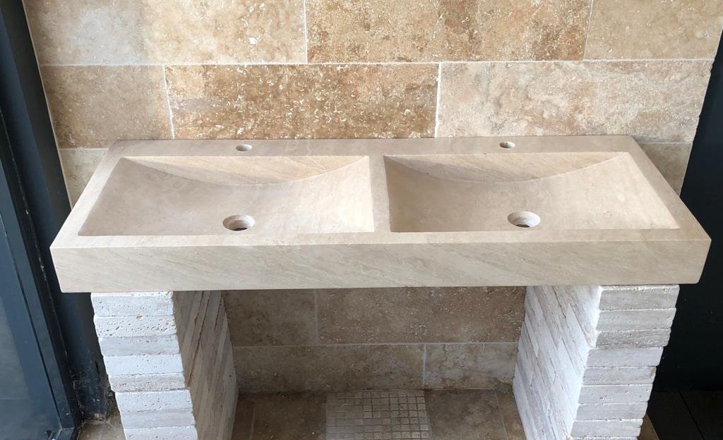 Double Lavabo en Travertin - Fabriqué à la Main en Pierre Naturelle - 120 x 45 x 10 cm