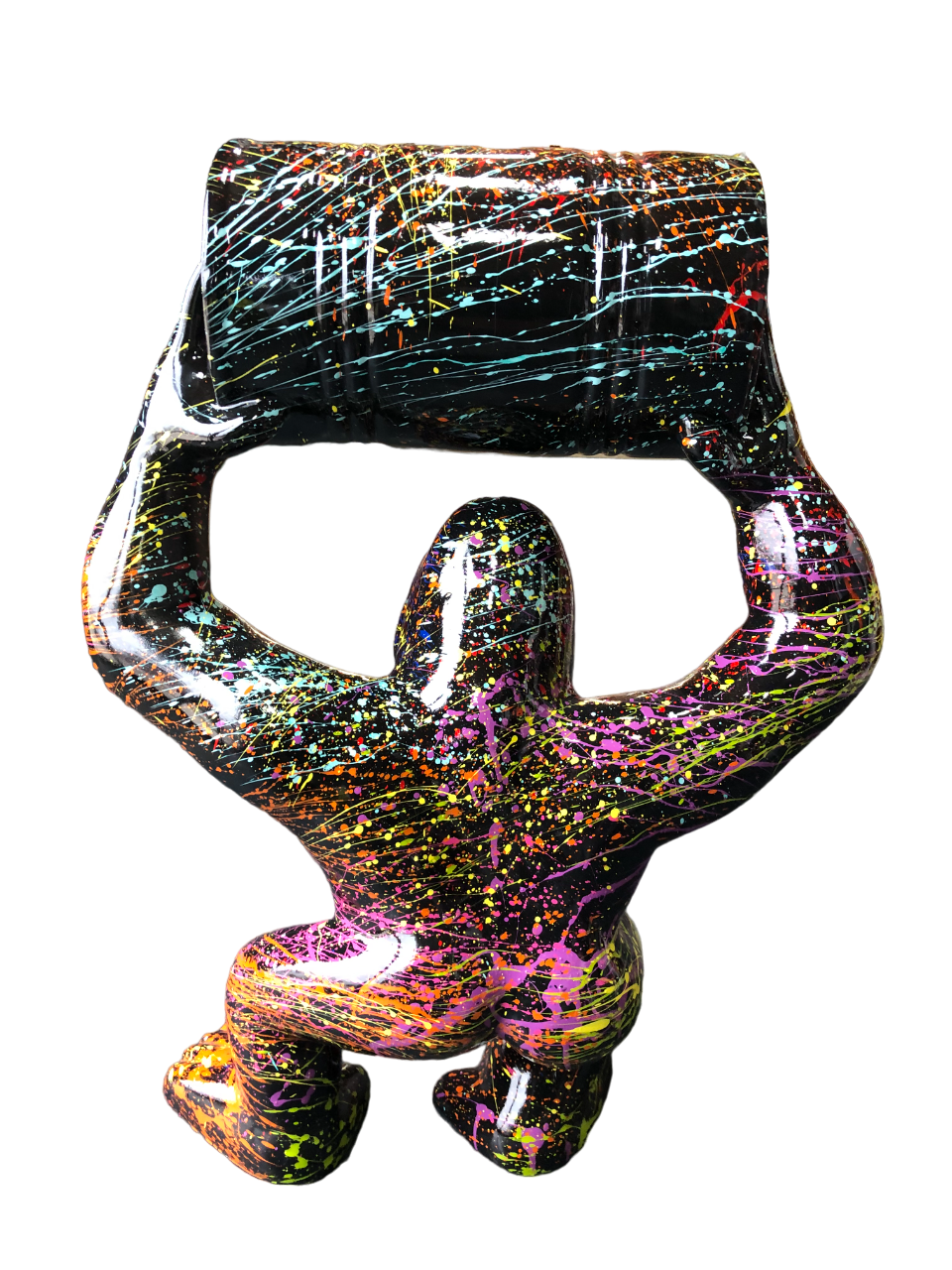 Statue en résine d'un Gorille ORIGAMI avec boîte poubelle noir/couleur/or - Résine fibre
